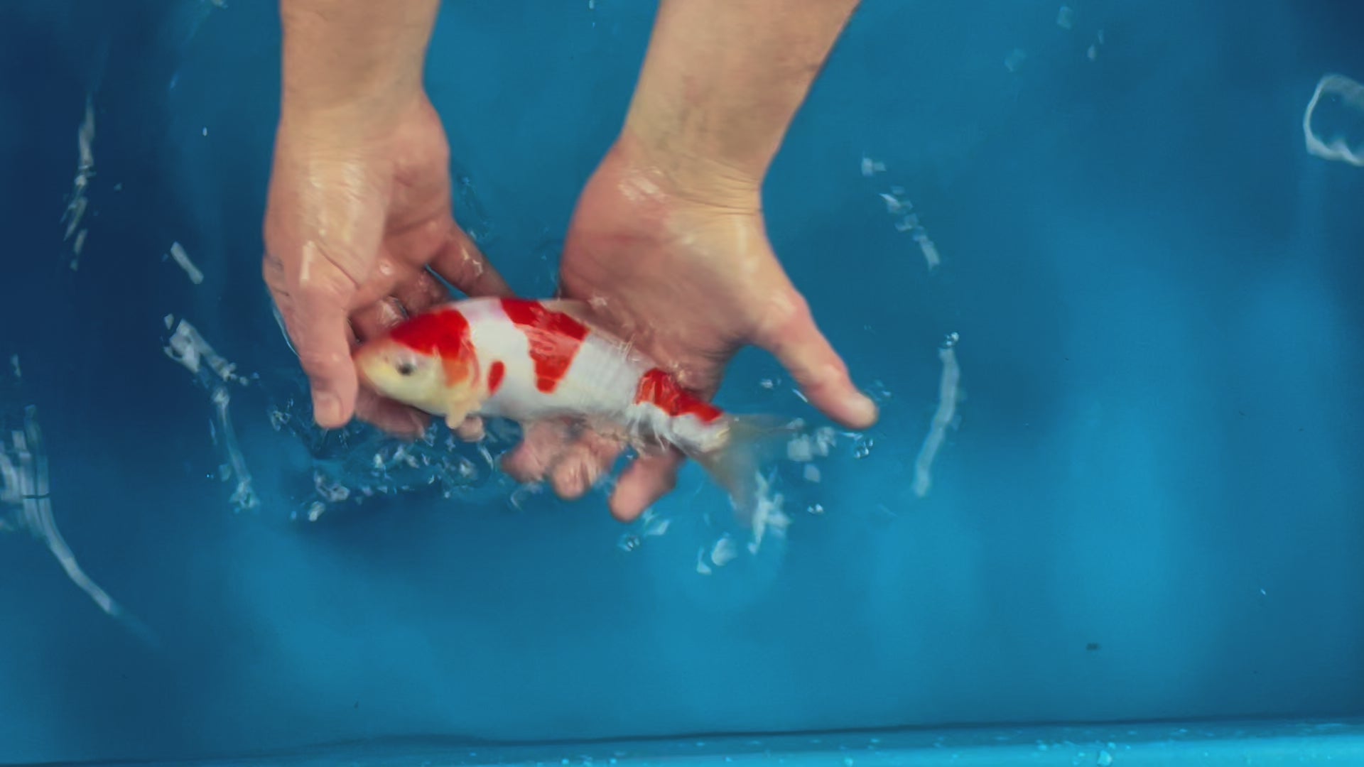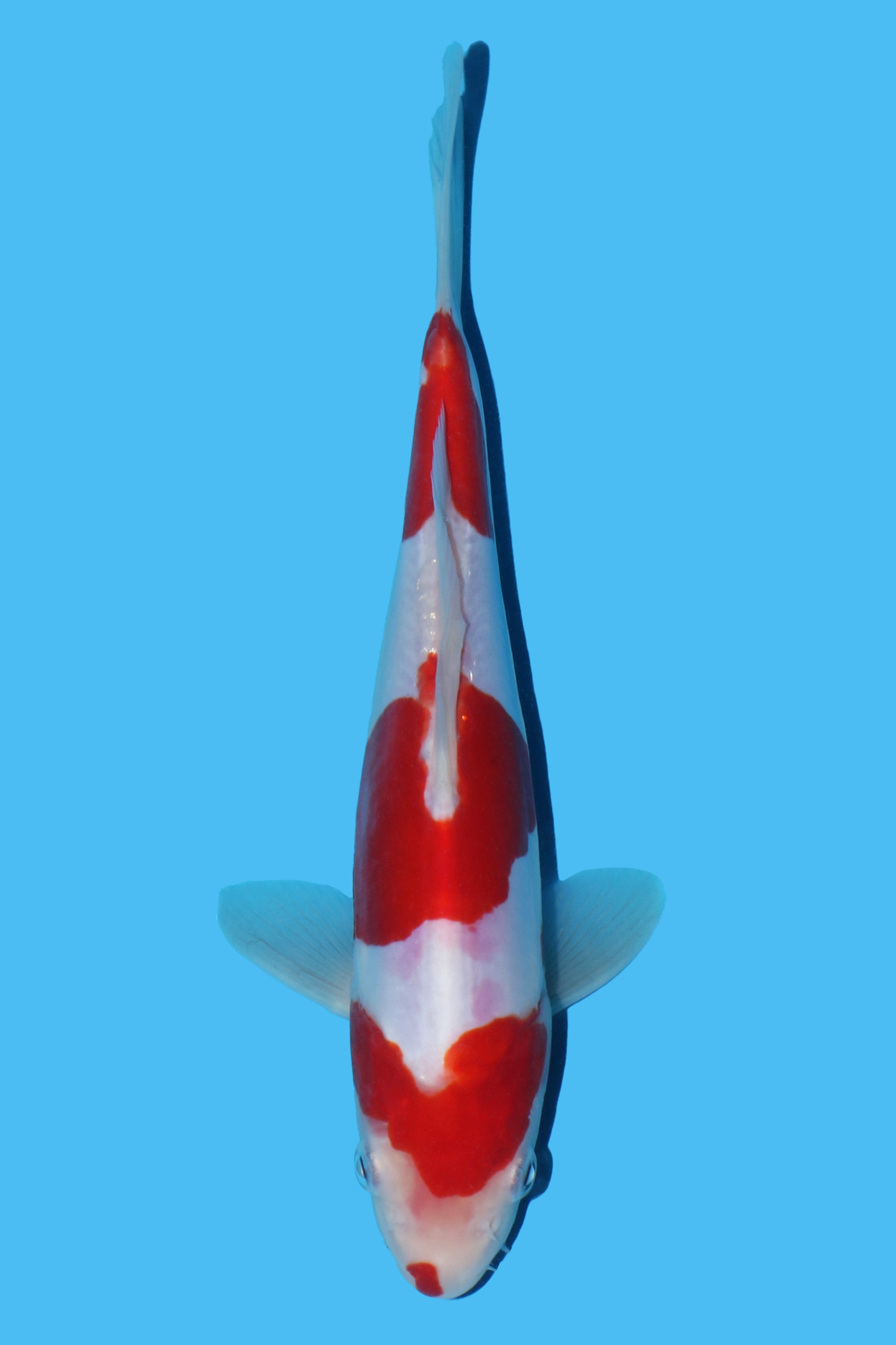 Maruhide is now one of the few established bloodlines in Niigata for Doitsu Gosanke. Having started part-time while working at Isa Koi Farm he has progressed into a fantastic independent breeder. This Doitsu Kohaku has nice deep beni and a nicely balanced sandan pattern. The areas of pink skin on the shiroji will clear as this koi grows bigger and the white skin thickens.