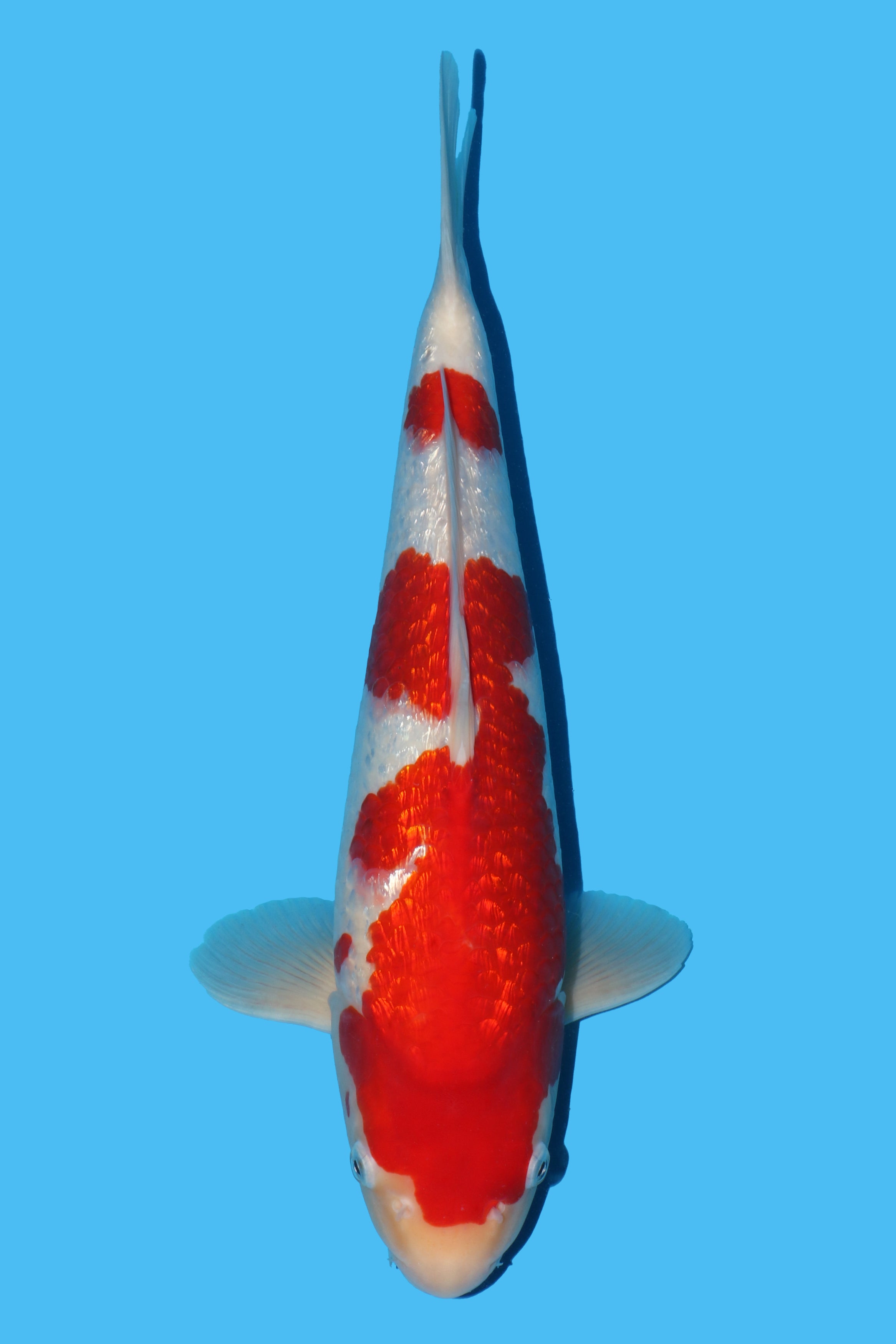 The most dominant breeder in Ginrin Kohaku right now! The quality of that Ginrin combined with the beni quality of Maruyama Ginrin Kohaku make them really stand out. This is a really strong koi with high quality now and great potential for the future. The body is very strong with more still to come, both kiwa and sashi nicely refined and a very well balanced pattern with nice technical qualities.