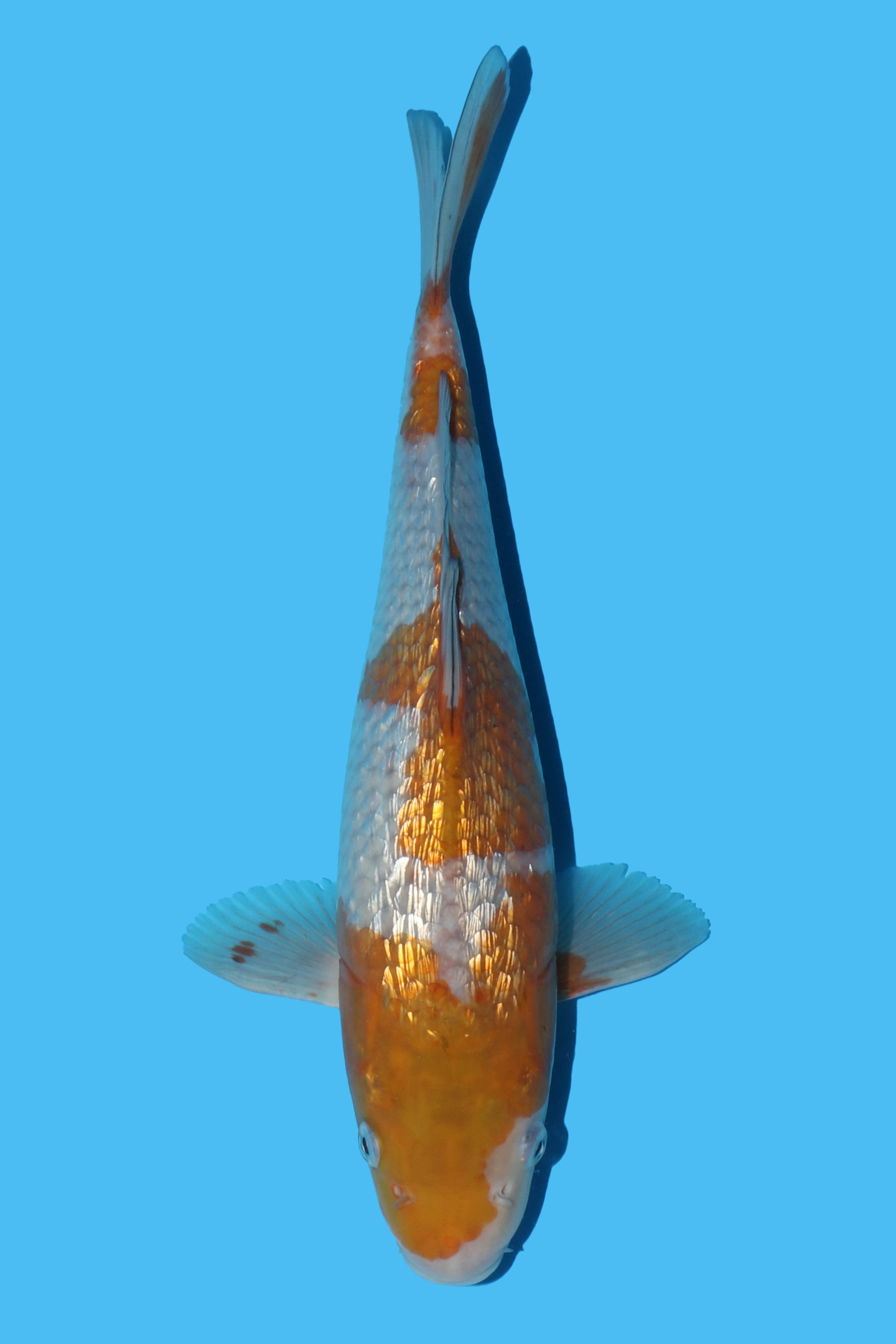 Koda Ginrin Ochiba are amongst the best out there for colour and stability. The bloodline was based on a 94cm female, koi show winning Ochiba. This one has an imposing head and stunning lighter colouration. The slight split in the pectoral fin will make a full recovery.