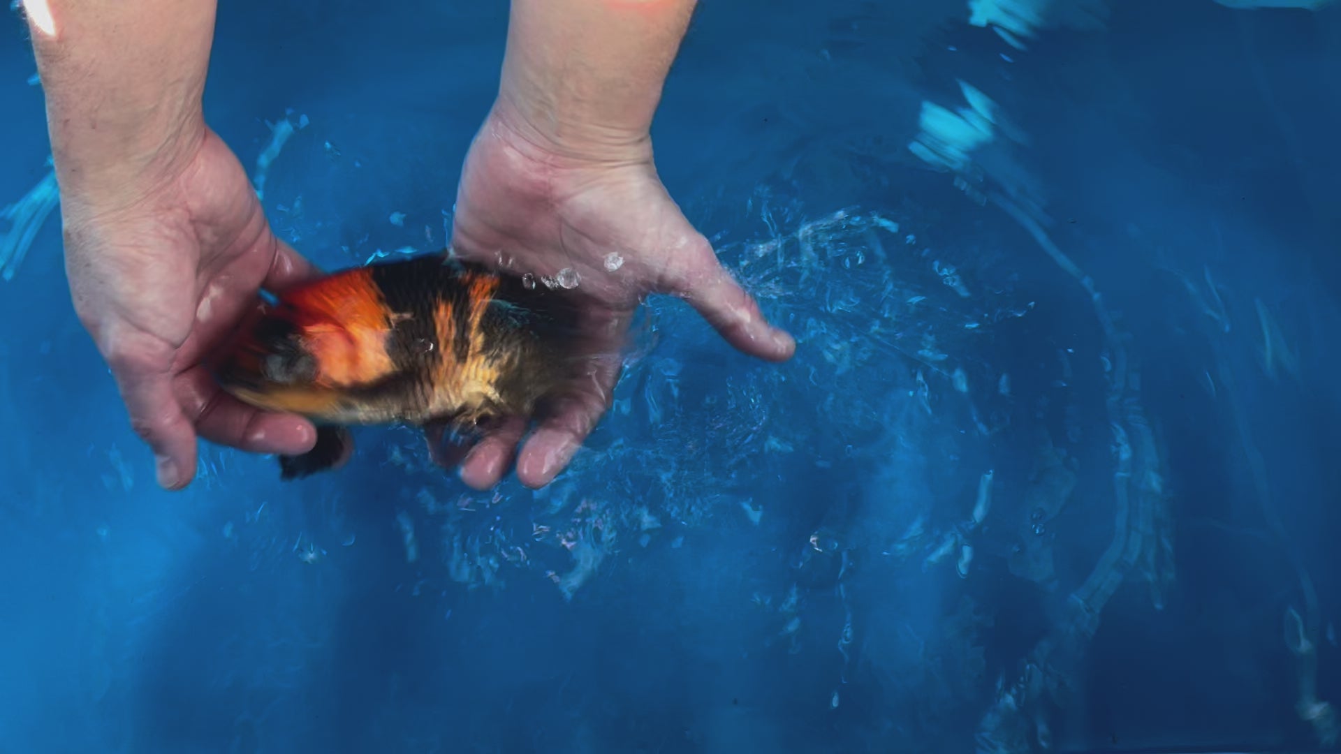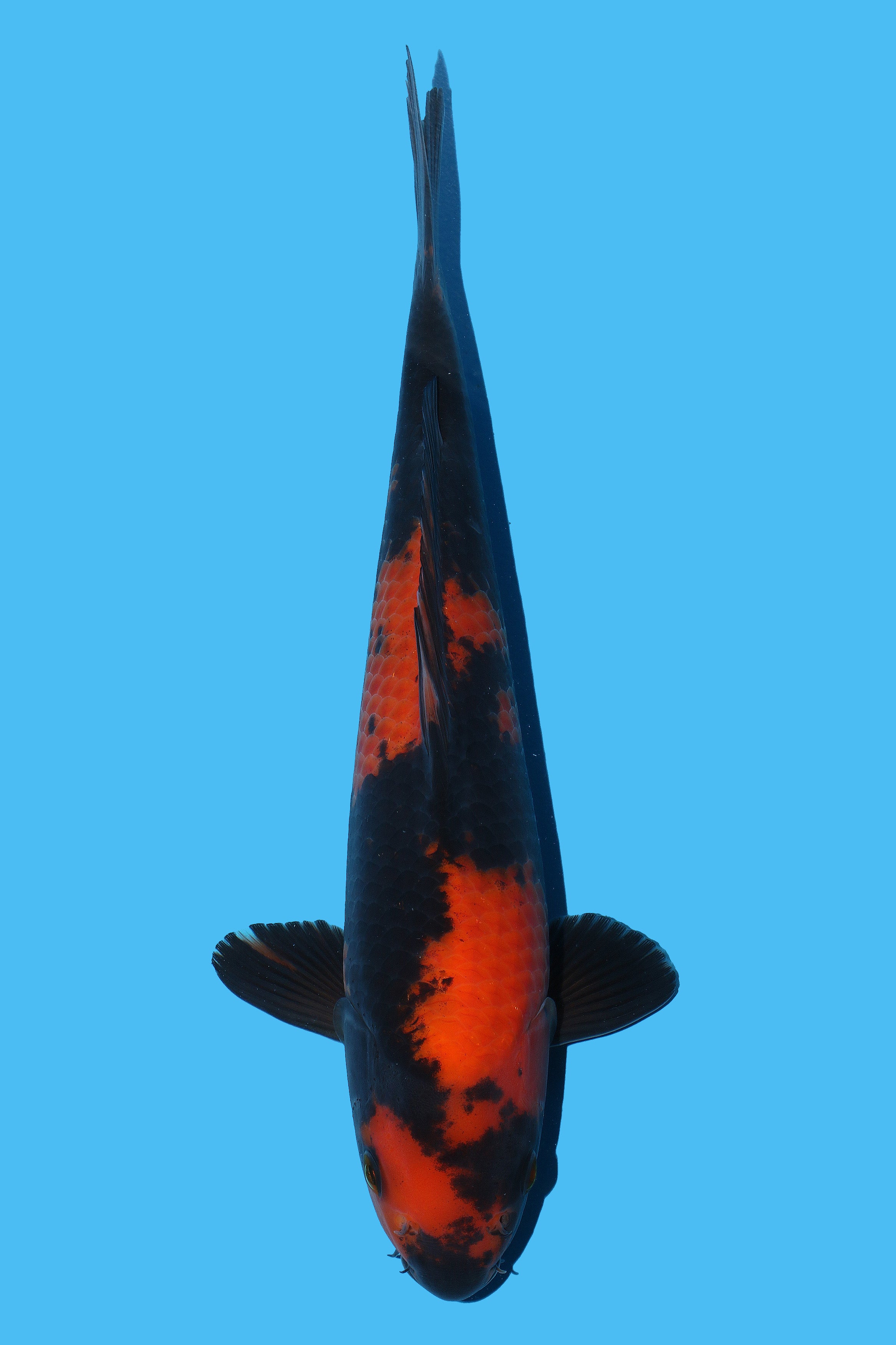 One from the Hi Utsuri master! The piece is showing great colour quality and a strong pattern. The menware of the head pattern is particularly pleasing. There is a tiny split in the edge of the fin that will recover in full.