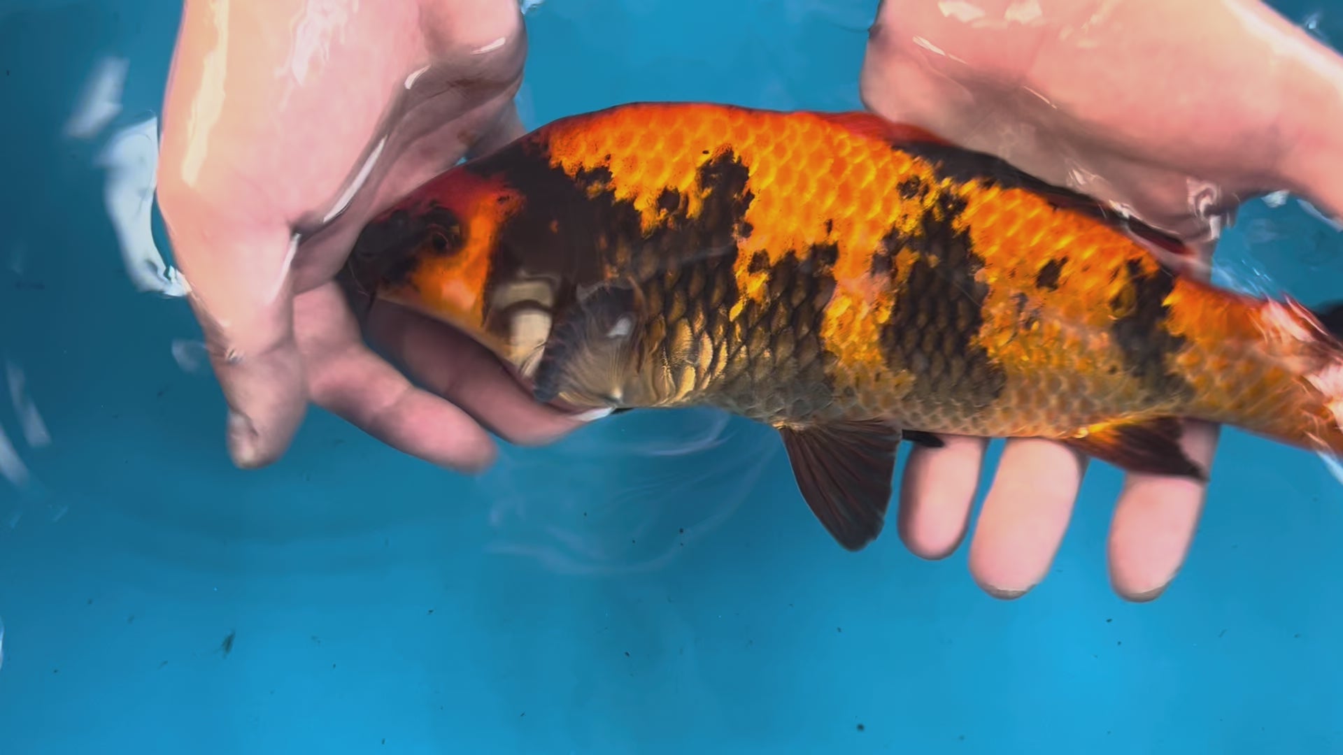 We have amazing success with Shinoda Hi Utsuri as the most prominent bloodline for this variety with true jumbo genetics. This example has a lighter sumi pattern and very good quality beni. The colour is clean and the hue will continue to intensify as it grows and the overal balance of the pattern is very nice.