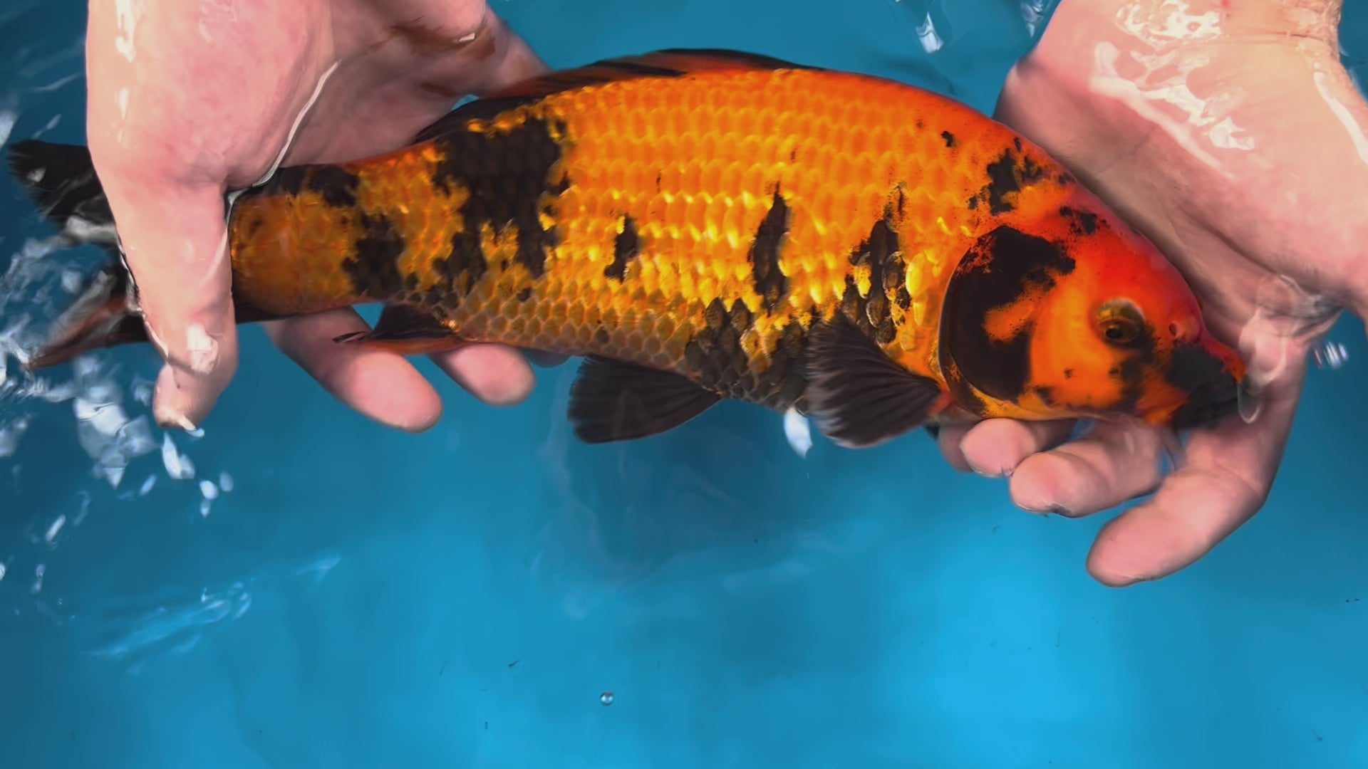 We have amazing success with Shinoda Hi Utsuri as the most prominent bloodline for this variety with true jumbo genetics. This example has a lighter sumi pattern and very good quality beni. The colour is clean and the hue will continue to intensify as it grows especially, right now it's a little softer due to being female.