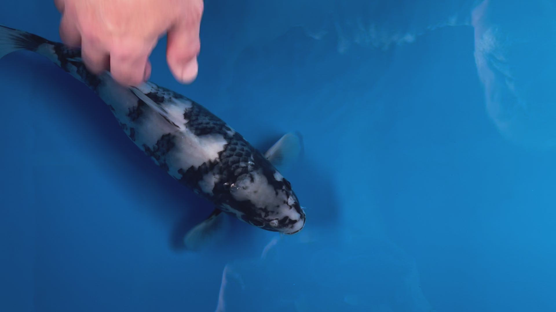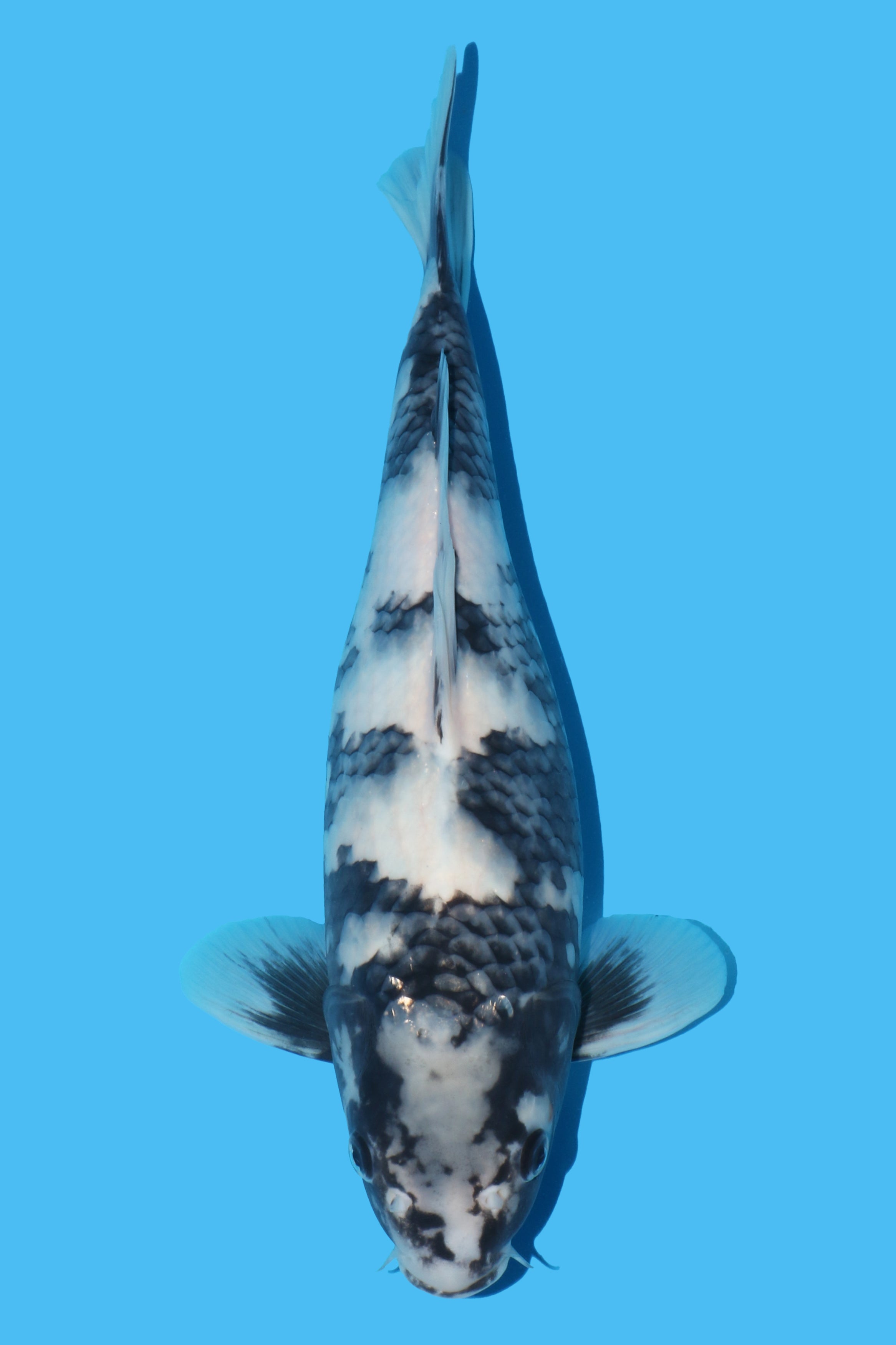 Body setup on this Okawa Shiro Utsuri is very typically female, strong head, shoulders and height behind the head indicating its potential. The sumi is developing very nicely, and given time to continue to mature this koi has a good future.