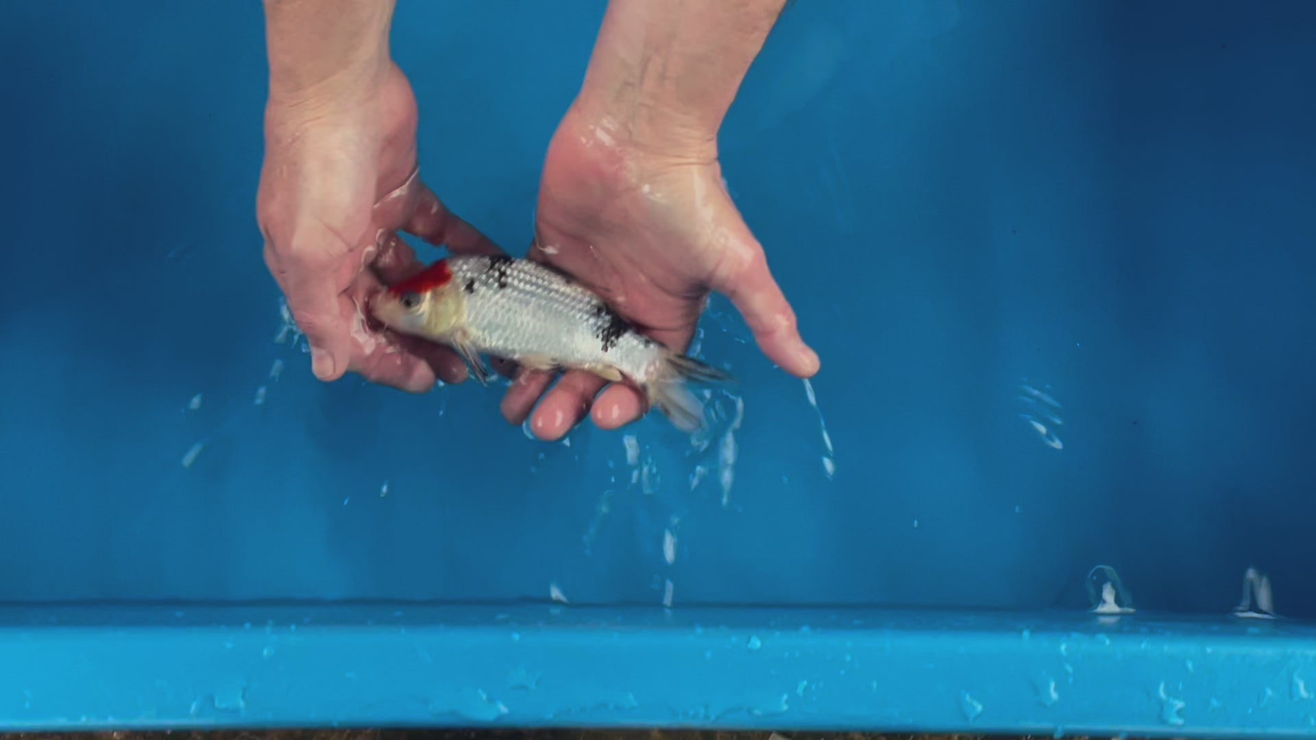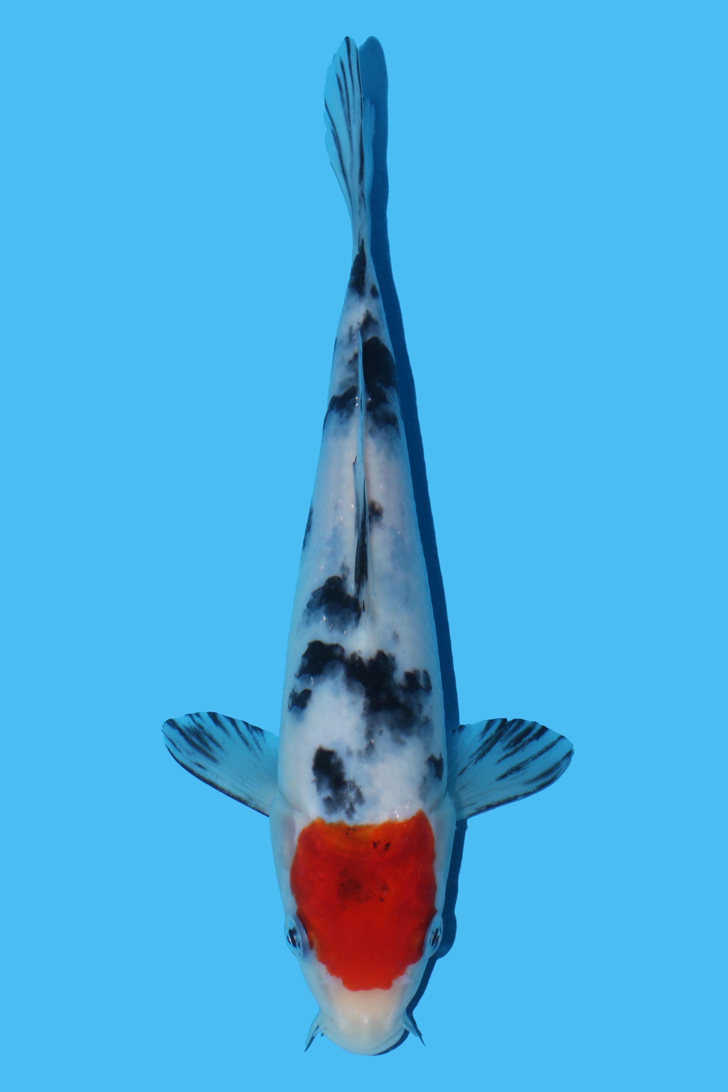 Behind every Tancho is typically a good gosanke bloodline and in this case the NND Marusho Sanke. Something to also know with young Tancho is that beni will contract as the koi grows so it's often better to get the spot slightly oversized as this one is. The colouration is good and consistent with a nice sumi pattern forming on the body.